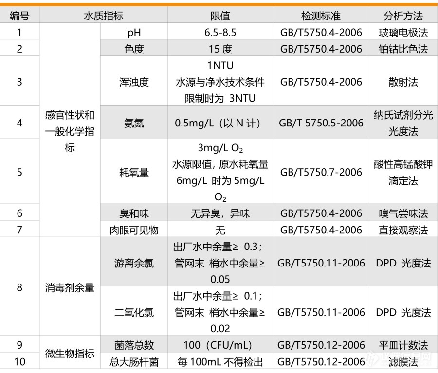 ● 检验项目:色度、臭和味、浑浊度、pH、氨氮、耗氧量、余氯(或二氧化氯)、菌落总数和总大肠菌群以及有关风险指标。