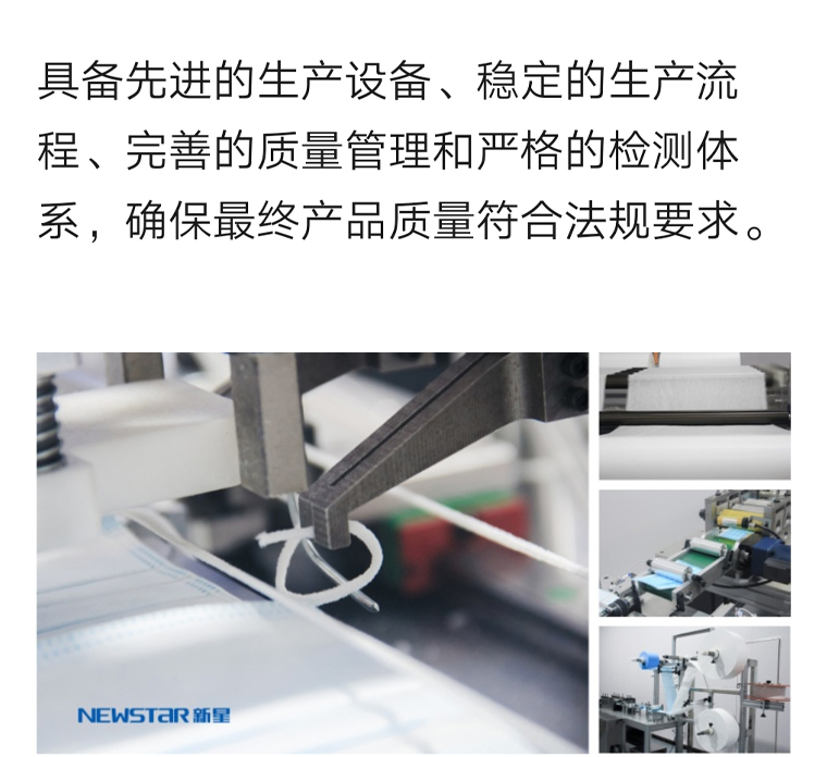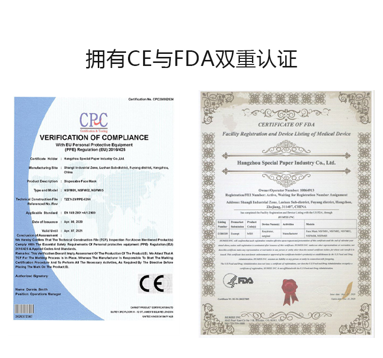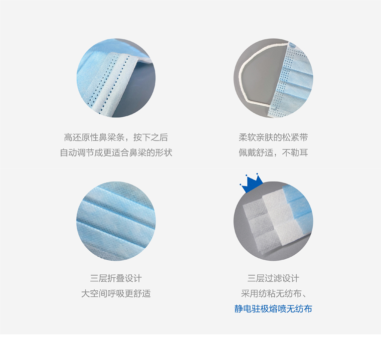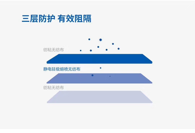 三层材质:2层纺粘无纺布,中间静电驻极熔喷布.细菌过滤效率95%以上。 已通过FDA和CE认证,放心选购。独立小包装,卫生更放心。先进的生产设备,稳定的生产流程,完善的质量管理和严格的检测体系,确保最终产品质量符合法规要求。