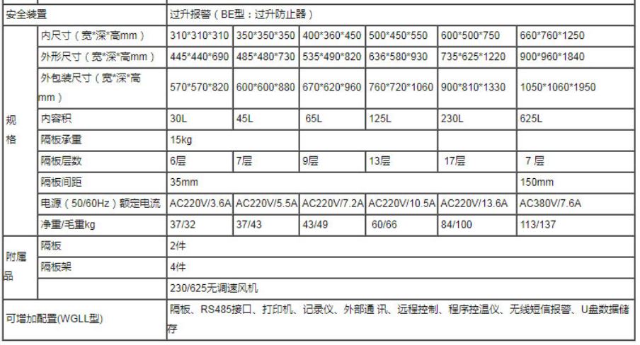 使用温度范围 RT+10~300℃ 温度分布精度 ±2.5% 内容积 30L 45L 65L 125L 230L 625L