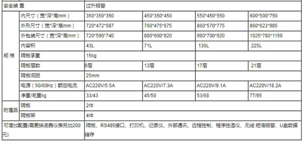 使用温度范围 RT+10~250℃ 温度分布精度 ±2.5% 内容积 43L 71L 136L 225L