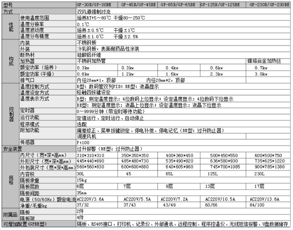 使用温度范围 培养RT+5~80℃ 干燥80~250℃ 温度分布精度 培养±1.0℃ 干燥±2.5% 内容积 30L 45L 65L 125L 230L