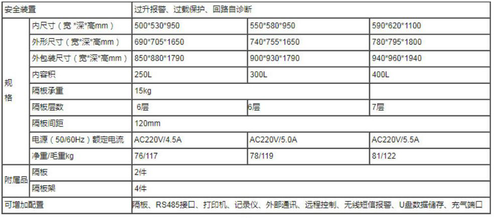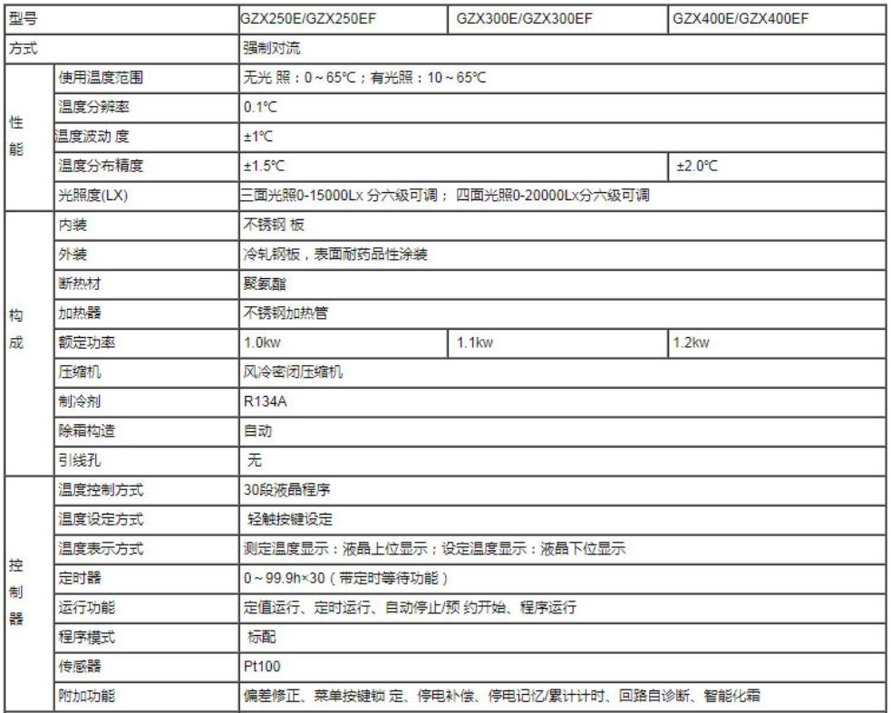 使 用温度范围 无光照:0~60℃ 有光照:10~60℃ 温度分布精度 ±1.5℃ 内容积 250L 300L 400L