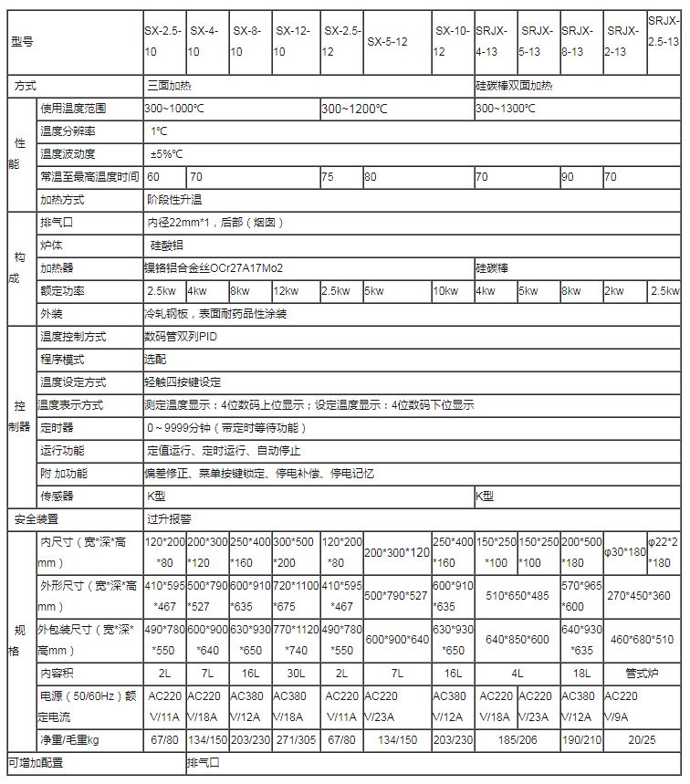 最高使用温度 10:1000℃ 12:1200℃ 13:1300℃ 温度控制精度 ±5%