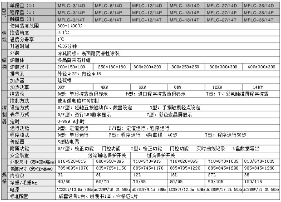 使用温度范围 300~1400℃ 温度控制精度 ±1℃ 内容积 3L 8L 12L 18L 27L 36L