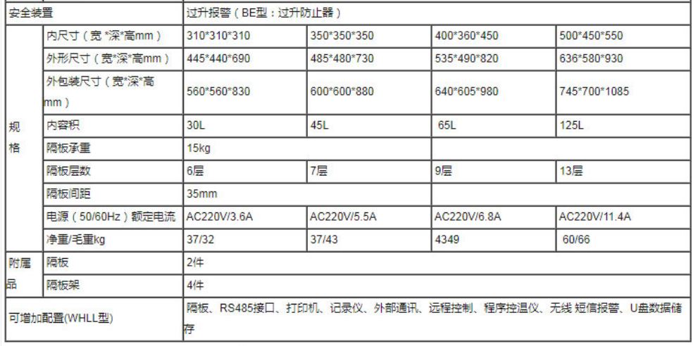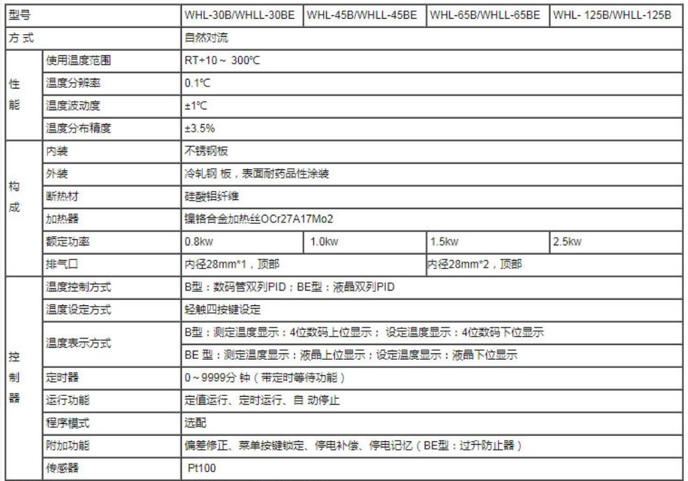 使用温度范围 RT+10~300 温度分布精度 ±3.5% 内容积 30L 45L 65L 125L 230L